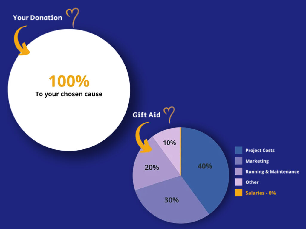 Our operating expenses are funded entirely through Gift Aid meaning all of your donation goes onwards to your chosen appeal/project.